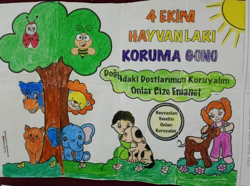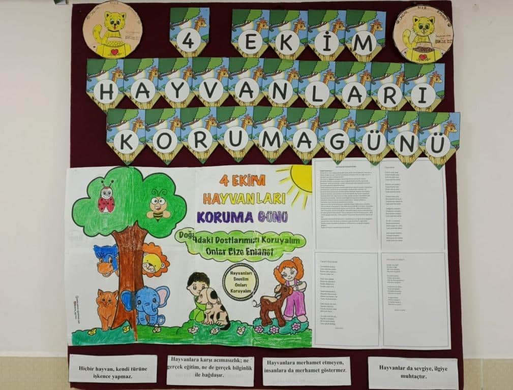 Okulumuzda, 4 Ekim Hayvanları Koruma Günü ile ilgili hayvan sevgisini ve onları korumanın önemini pekiştirmek amacıyla çeşitli etkinlikler yapıldı. Sınıflarımızda yapılan etkinliklerde çocuklarımız hayvan temalı animasyon filmler izleyerek, resimler çizerek duygularını renklerle ifade ettiler. Hazırlanan resimler sınıf ve okul panolarında sergilendi. Etkinlikler kapsamında bazı sınıflarda kedi ve köpekler için mama dağıtımı da yapıldı. Çocuklarımız, sokak hayvanlarını korumanın sadece sözle değil, küçük ama anlamlı davranışlarla da mümkün olduğunu yaşayarak öğrendiler.